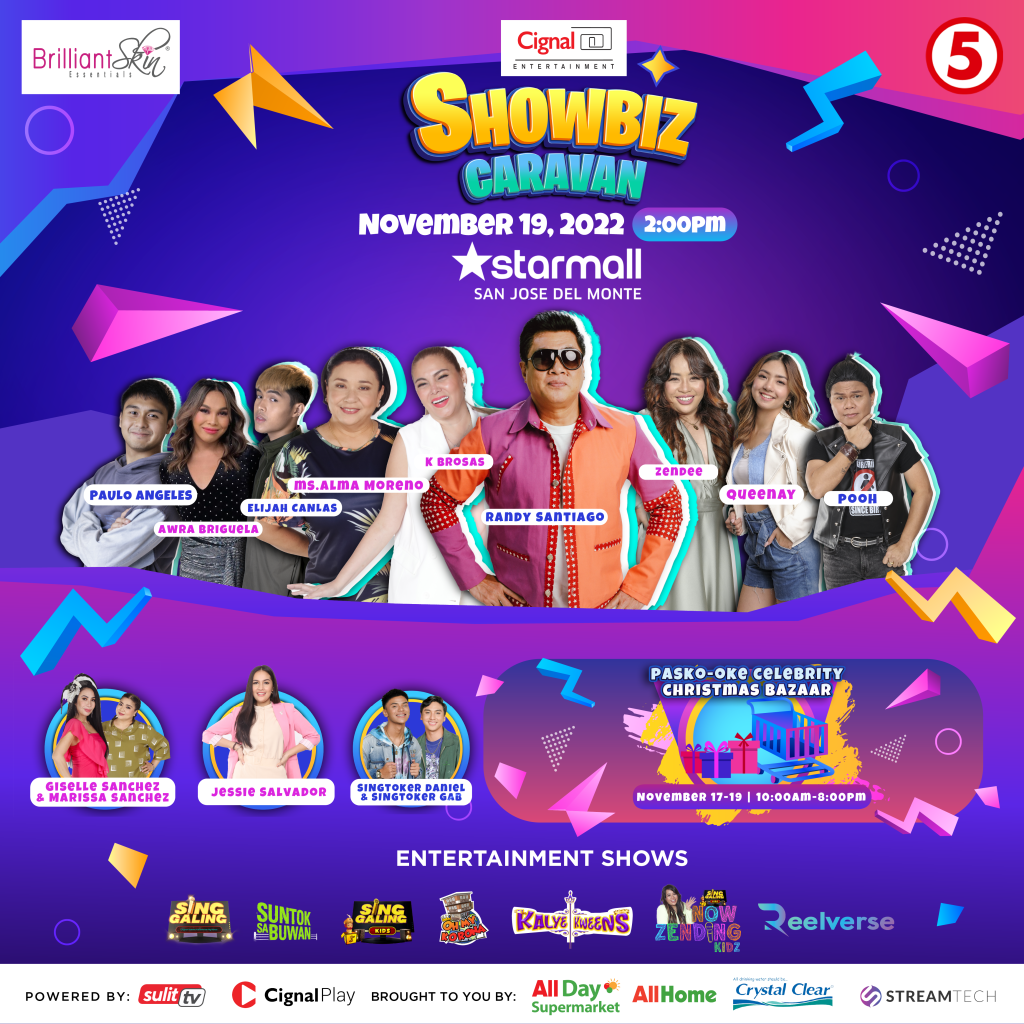 Happening from November 17 to 19, Cignal Entertainment hosts another interactive showbiz caravan, this time at Starmall San Jose Del Monte, Bulacan. This exciting event will highlight the upcoming finales of the comedy programs “Oh My Korona” and “Kalye Kweens,” the movieserye “Suntok Sa Buwan,” and the grand finals of the bidaoke kantawanan ng bayan “Sing Galing” and “Sing Galing Kids.”