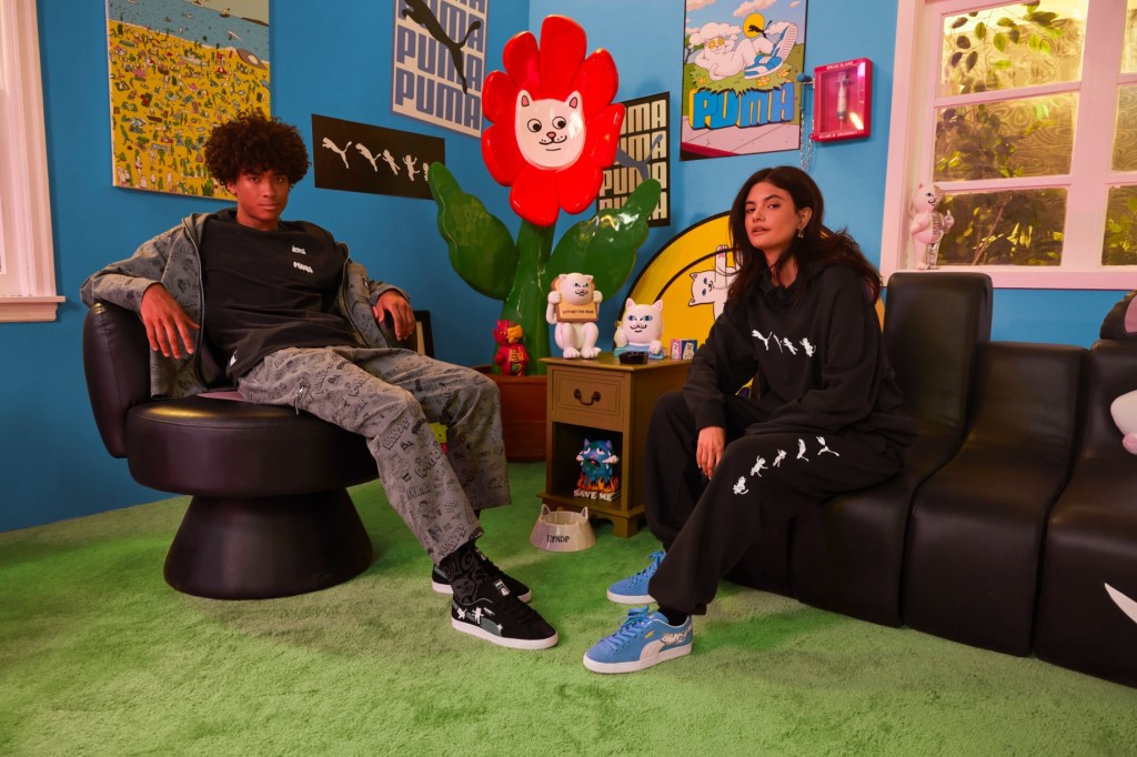 Bringing a new flavor to streetwear fashion, this partnership’s apparel offerings are centered around cut-and-sew garments like the matching Twill Shirt and Twill Pants, adorned with a playful allover pattern featuring RIPNDIP tags, a frisky Lord Nermal, and flash designs throughout. Cozy essentials are included in the form of a collaborative Hoodie and Sweatpants, plus three unique Graphic T-shirts featuring custom designs created by PUMA and RIPNDIP. Select pieces show Lord Nermal as he pounces into action, evolving into PUMA’s cat logo.