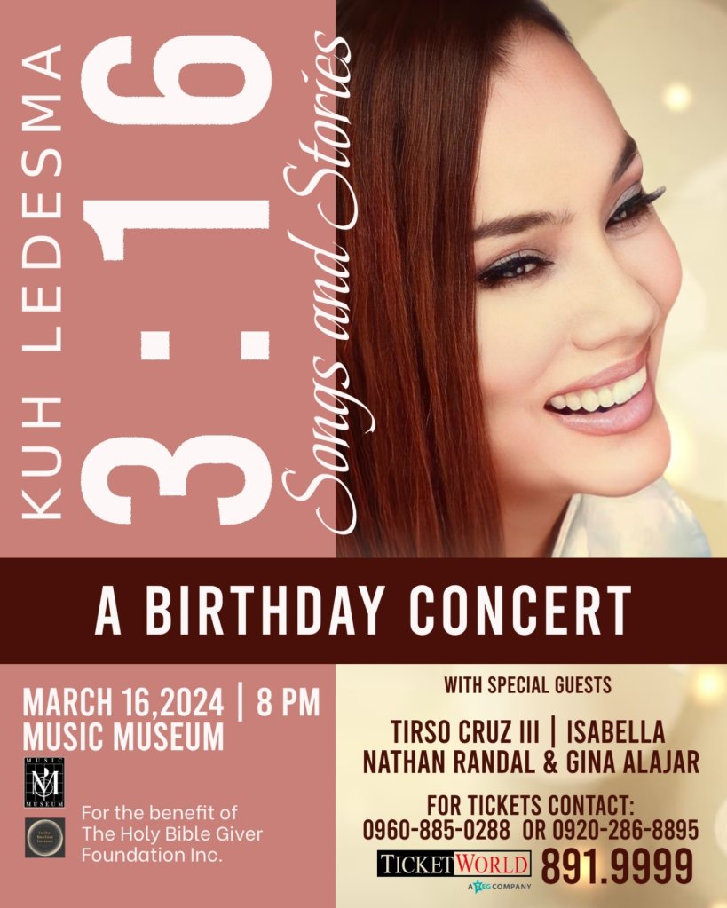 Prepare for a night of music and inspiration as the Philippines’ very own pop diva, Kuh Ledesma, staged a special birthday concert this year. The event, titled “3:16,” will take place at the Music Museum in Greenhills San Juan. This year marks Kuh’s 3:16, the numeric equivalent of her birthdate, March 16, which signifies the many blessings she and her family have received over the years.
