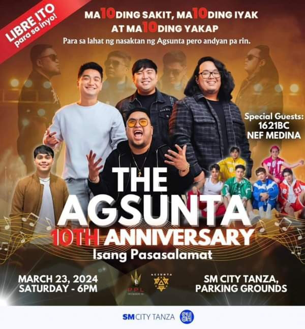 The “Agsunta 10th Anniversary: Isang Pasasalamat” concert, promises to be an unforgettable evening filled with nostalgia, celebration, and, most importantly, gratitude. Taking place at the spacious SM City Tanza parking grounds, the event will kick off at 6:00 PM, welcoming fans of all ages to come together and revel in the magic of AgSunta’s music.