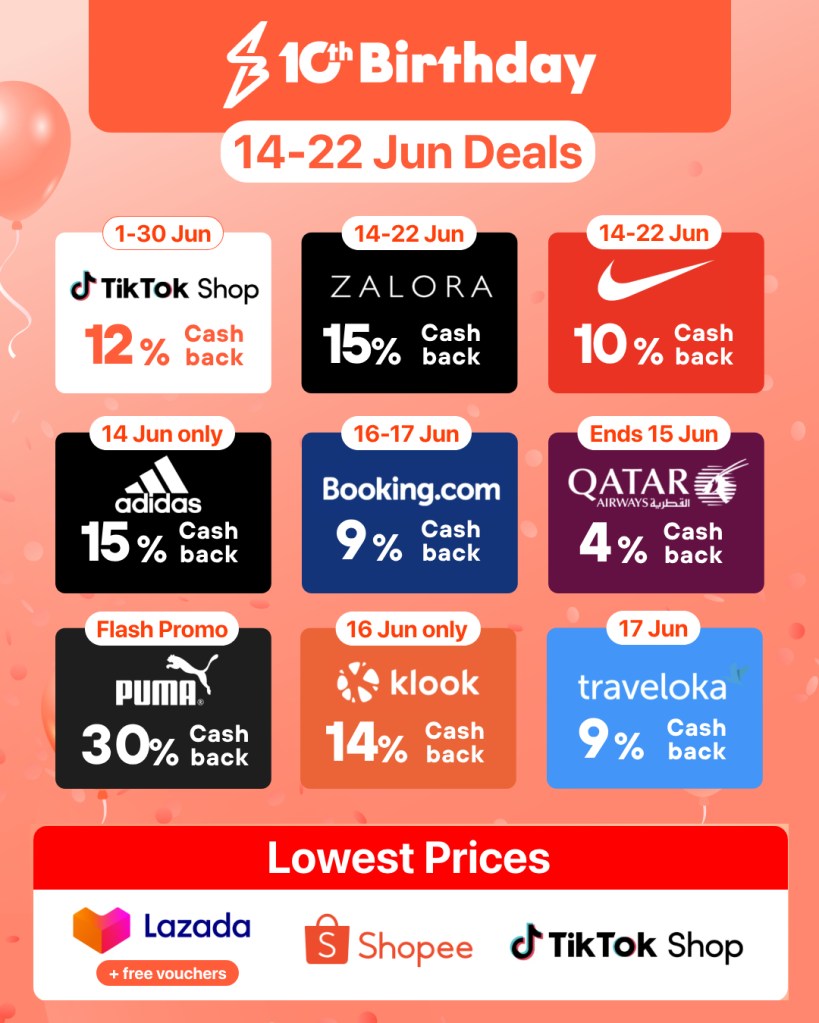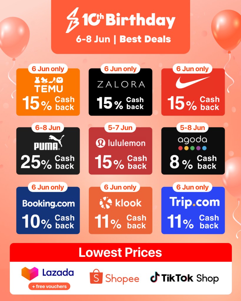 ShopBack’s 10th Birthday campaign runs throughout the entire month, beginning with the 6.6 Mid-Year Sale and leading up to the main birthday celebration from June 14-22. During this period, each category—travel, fashion, food, and marketplaces—will feature special highlight deals.