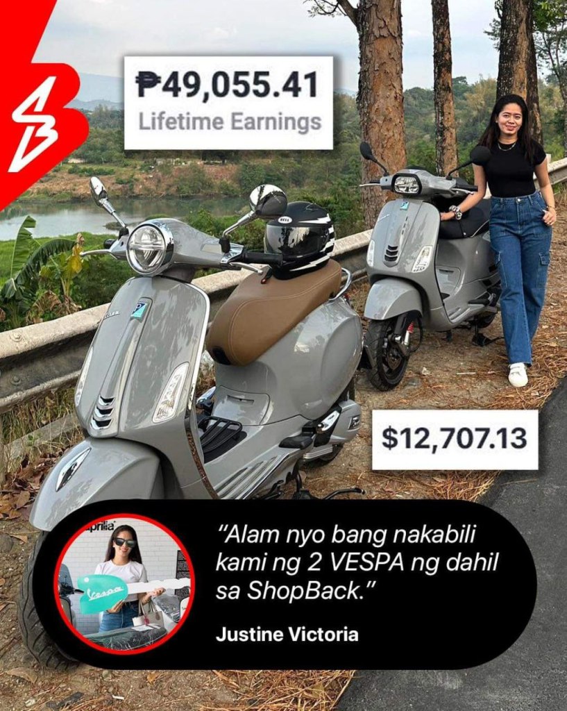 Justine Victoria discovered ShopBack in 2022, initially creating an account while in Singapore and then another upon returning to the Philippines. “I was able to withdraw ₱500,000 and bought two Vespa motorcycles,” she says.