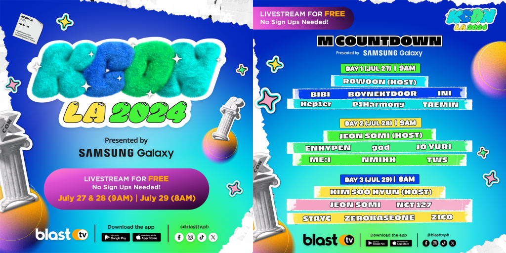 Pinoy K-Pop fans catch the back-to-back shows of KCON LA 2024 at the M COUNTDOWN for FREE exclusively on BlastTV in the Philippines on July 27 & 28, 9:00 AM (Philippine Time) and July 29, 8:00 AM (Philippine Time). No need to sign up! Just download the BlastTV app from Google Play or the Apple App Store.