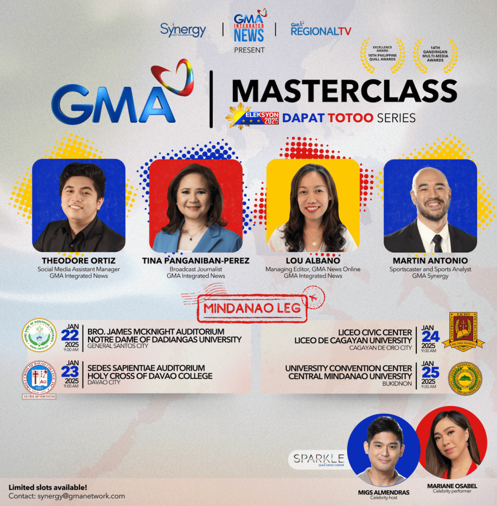 Whether you’re a university student or a young professional eager to learn about the importance of honest elections, the GMA Masterclass: Eleksyon 2025 Dapat Totoo Series is an event you won’t want to miss. Let’s raise our voices for truth and integrity in the electoral process, and remember—your vote counts!